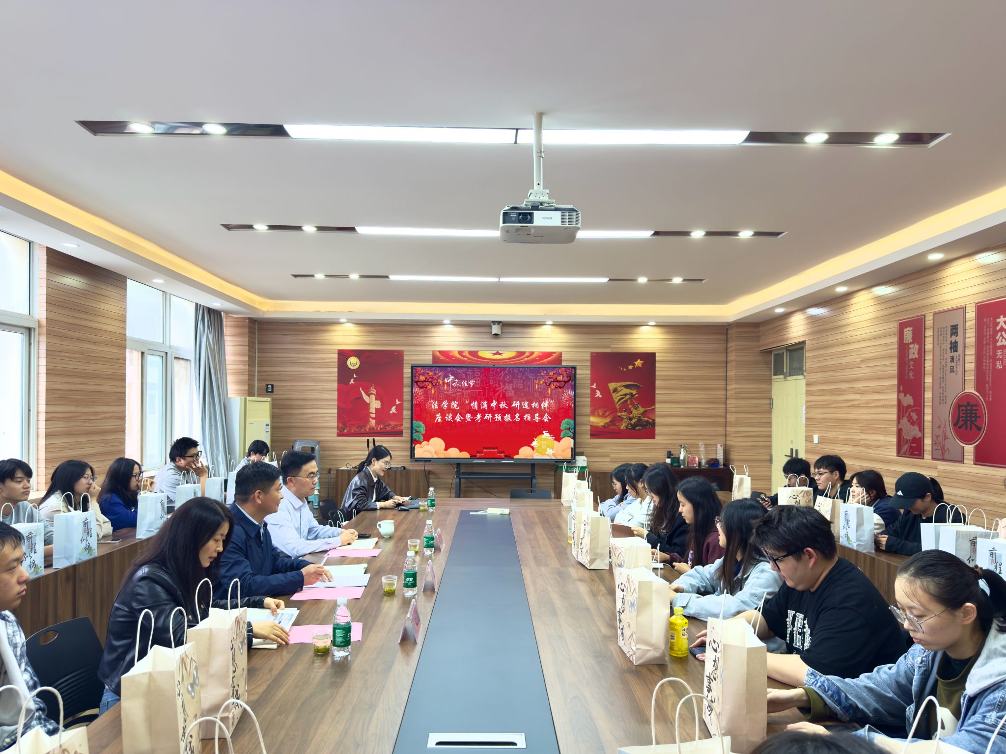党委书记许文、院长张道许、学工办主任庞文娟、2022级辅导员吉利与留校考研学子齐聚一堂,共庆中秋,交流备考心得。