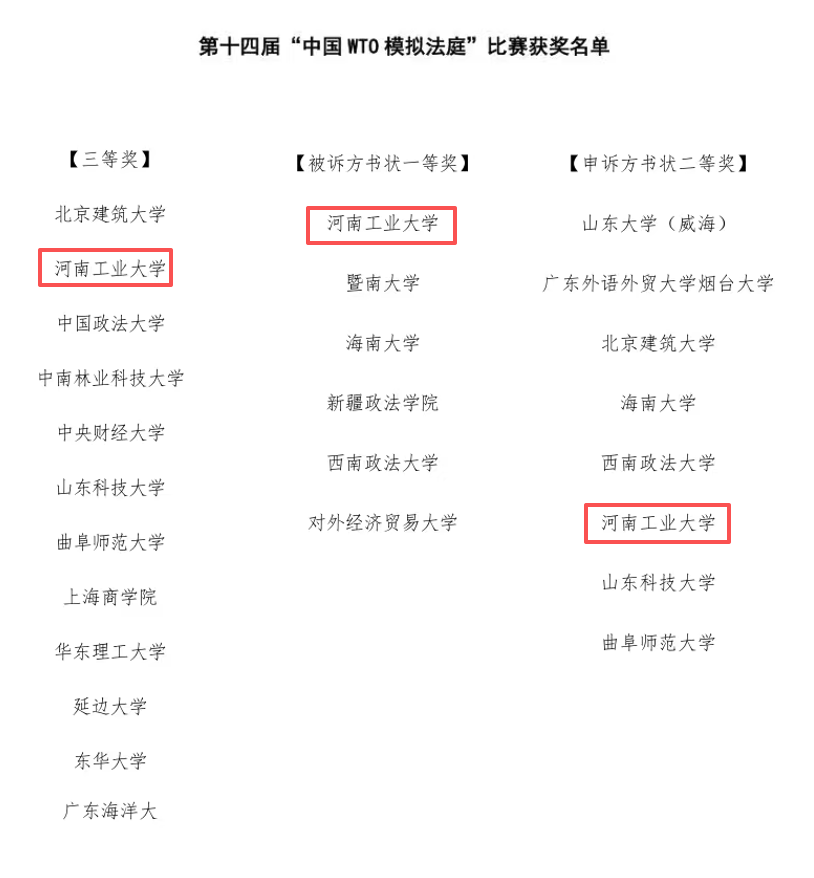 代表队荣获全国三等奖、应诉方书状一等奖、申诉方书状二等奖的优异成绩。“中国WTO模拟法庭竞赛”是由中华人民共和国商务部和高等院校主办的国际法模拟赛事,是加强涉外法治实践的重要平台。