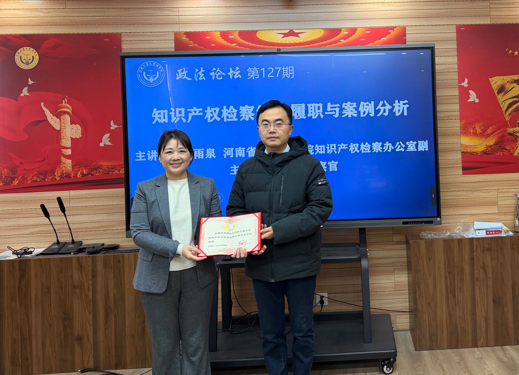 在3424会议室成功举办“政法论坛”第127期学术报告会。河南省人民检察院知识产权监察办公室副主任、三级高级检察官郭雨泉以“知识产权检察综合履职与案例分析”为主题开展了一场精彩而丰富的学术报告。报告会由91网站
