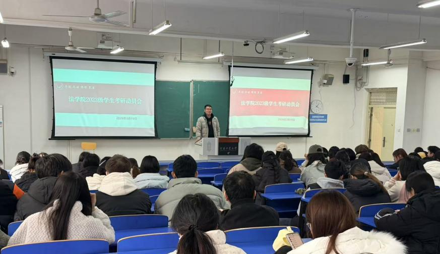 在3223召开考研动员大会。会议由辅导员李朝锋老师主持,2023级全体法学专业学生参加。